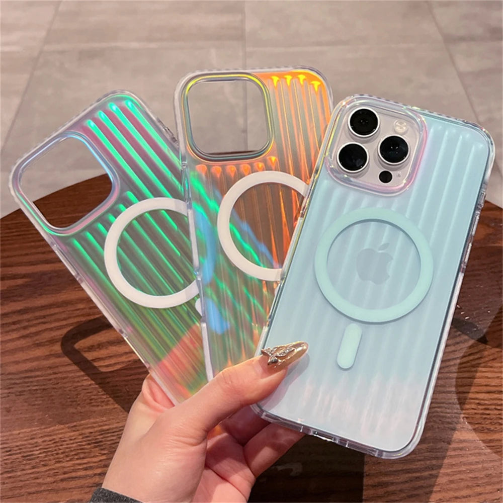 Luxury Aurora Laser Gradient Stripes Magnetic For Magsafe Case For iPhone 17 15 14 13 16 Pro Max Plus Wireless Charging Cover