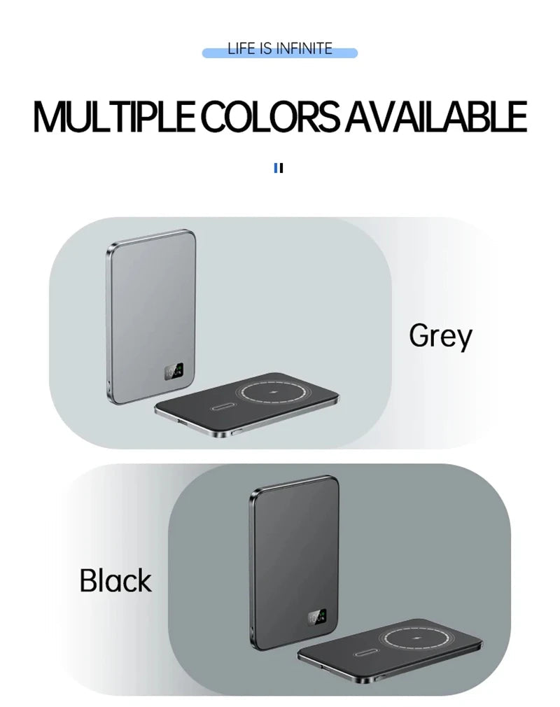 Magsafe Powerbank 50000mAh with PD20W fast charging and LED display. Ultra-thin aluminum alloy design offers secure magnetic attachment to MagSafe devices while remaining lightweight and portable. Supports two-way quick charge via USB Type-C. Compatible with MagSafe-enabled phones and tablets. CE certified with lithium battery technology for reliable, efficient charging on the go.